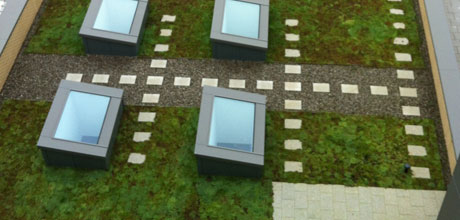 As well as providing the roof top with pleasing aesthetics there are many environmental benefits to living roofs, recycling of CO2 into O2, improving building air quality by locking up airborne pollutants. Other advantages are a better acoustic performance and reducing the risk of flooding as the living roof soaks up rainwater and then releases it slowly to the gutters or outlets.